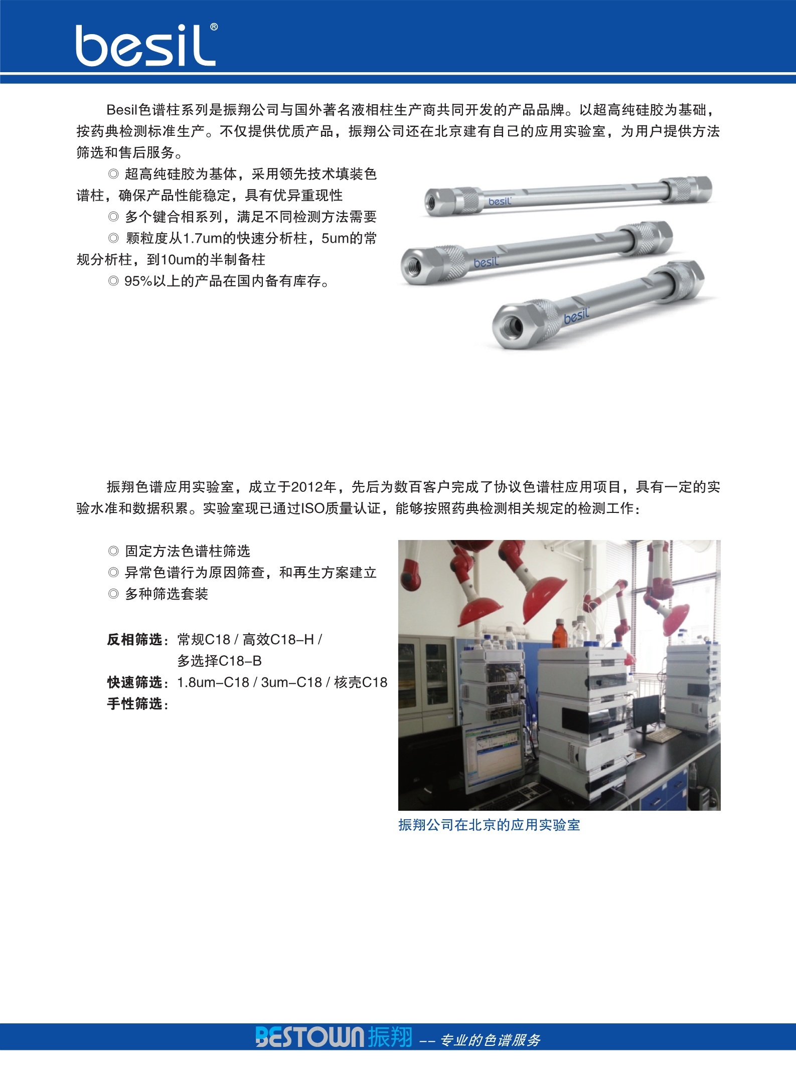 Besil色谱柱系列是振翔公司与国外著名液相柱生产商共同开发的产品品牌。以超高纯硅胶为基础,按药典检测标准生产。不仅提供优质产品,振翔公司还在北京建有自己的应用实验室,为用户提供方法筛选和售后服务。